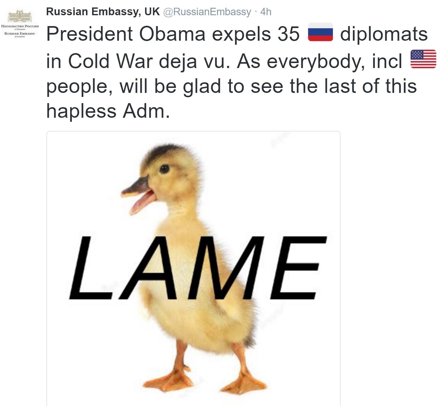 俄罗斯驻英国大使馆在推特上发文称,奥巴马的制裁是“似曾相识的冷战”,还称所有人,包括美国人,都很乐意见到倒霉的奥巴马当局的最后时刻。