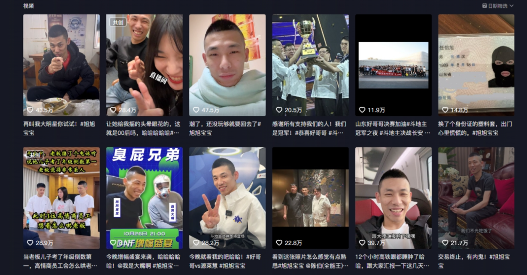 以他的短视频的数据做举例,我们会发现最近这段时间旭旭宝宝的数据明显下降了。在宣布加盟抖音后,旭旭宝宝一共发了24条短视频,前12条短视频,最低点赞15.9万,最高175.5万,超过50万点赞的有6个。