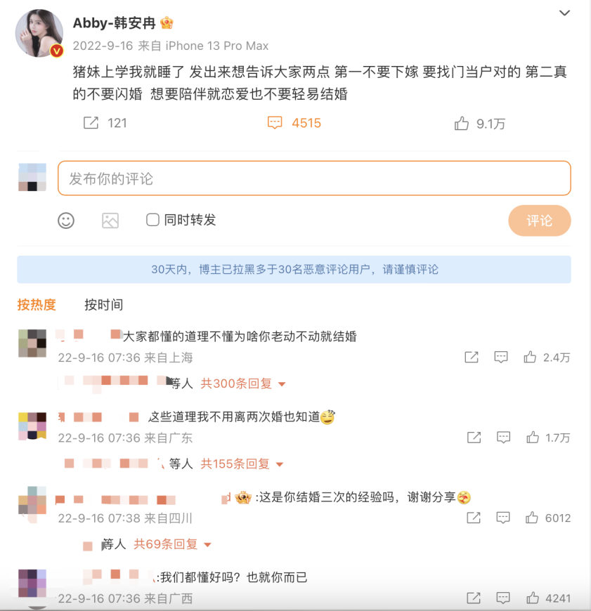 虽然韩安冉也一直在分享诸如“不要闪婚”、“不要轻易结婚”的婚恋观,但网友们并不买账,纷纷嘲讽“我们都懂好吗?也就你”、“得了吧,你自己过的一团糟还给别人建议。”