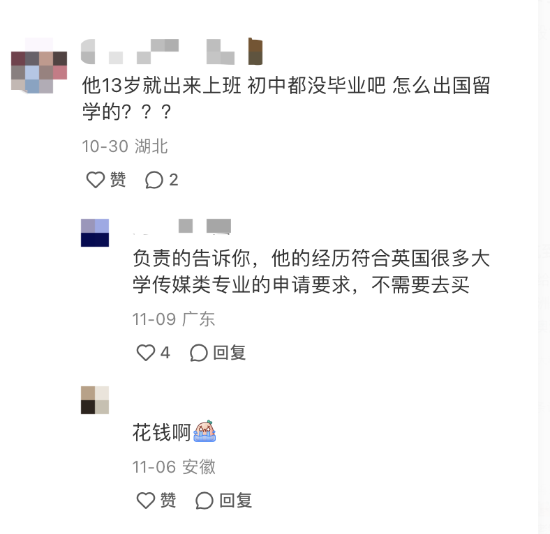 当然也不乏质疑的声音,有人表示“他13岁就出来上班,初中都没毕业吧,怎么出国留学的”、“大概率镀金去了”、“能不能来英国把卫生纸的价格打下去?”
