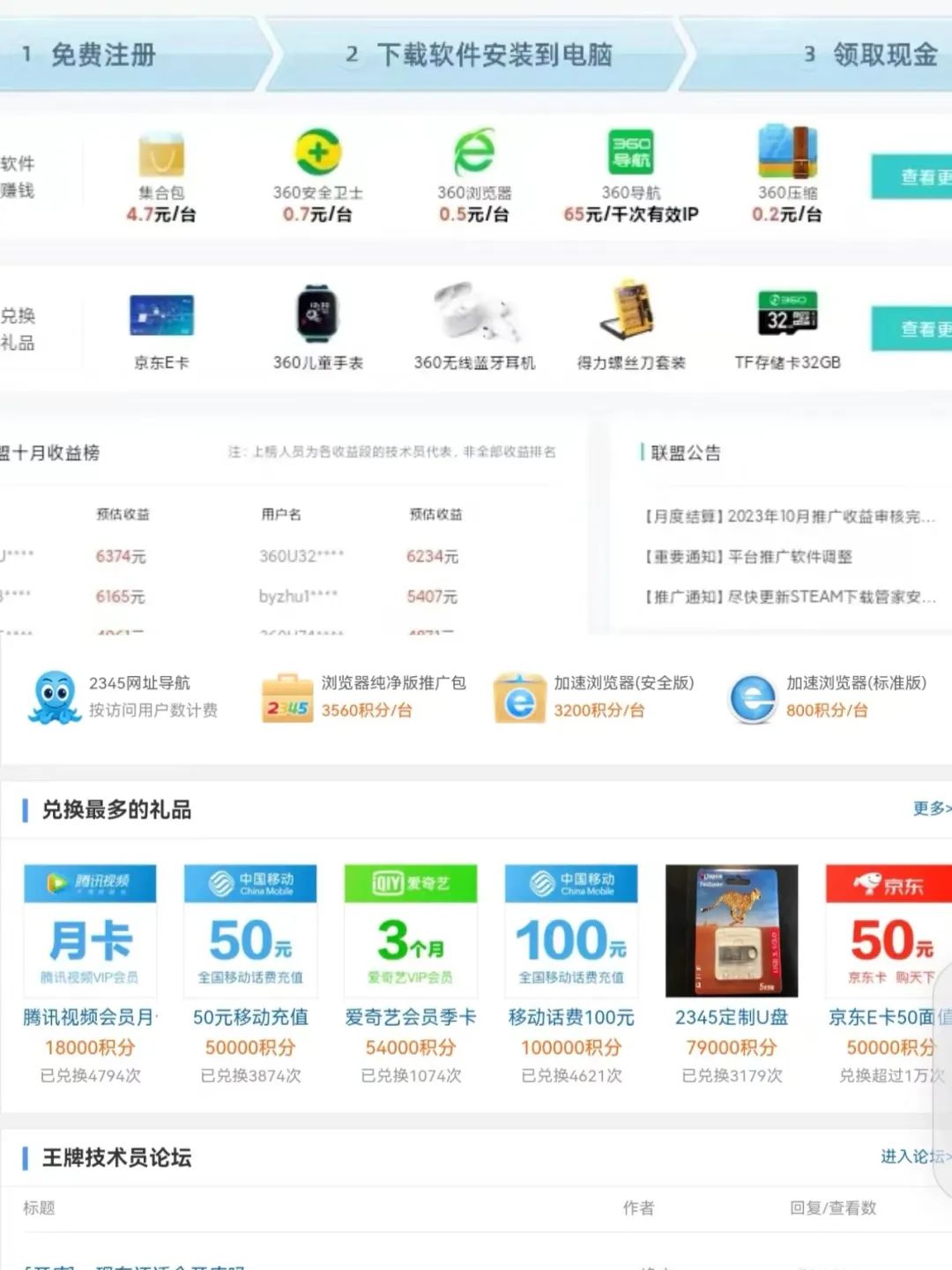 国内从事系统装机软件推广的主要有两大平台,2345装机联盟和360有钱联盟。其官网显示,安装旗下安全卫士、浏览器、导航、压缩等全家桶软件,每次可以获得0.5元到4.7元的现金,或者用积分兑换各种礼品卡转售。