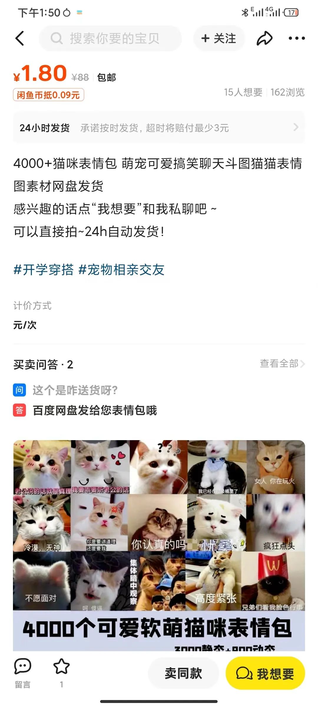 利用闲鱼这个规则,小叶把主图换成了各种猫咪相关的梗图,表情包和名场面。表情包也是在闲鱼买的,1.8元4000个。几个月下来,钱没赚多少,玩梗玩的起飞,手里的旧猫笼基本只能卖给贫穷并且“有毒的”大学生:“我原价六百多的猫笼,她们100就拿走了。还软磨硬泡拿走了我的猫碗猫草猫砂盆。四个学生来我家拆了半天笼子拆不开,又花20叫了跑腿服务帮她们拆笼子。”主打一个该省省该花花。