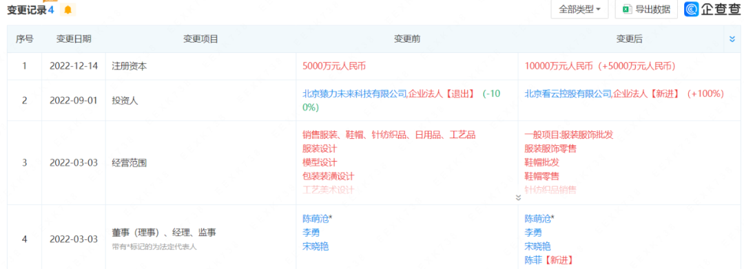 企查查工商变更记录显示,2022年9月1日,北京冰原服饰有限公司投资人由北京猿力未来科技有限公司全资控股变更为北京看云控股有限公司全资控股(下称:看云控股)。而北京看云控股有限公司成立于2021年12月;目前,看云控股共对外全资控股三家企业,李勇均出任执行董事。三家企业分别涉及SKYPEOPLE 天空人羽绒服、Grid Coffee、茉莉智慧母婴护理中心三个品牌。