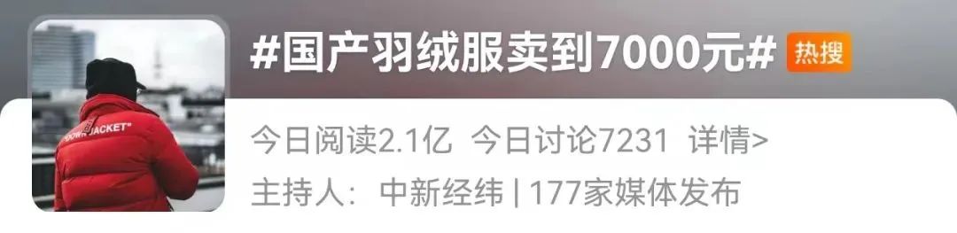 昨日,“国产羽绒服卖到7000元”冲上微博热搜总榜第一,话题引发超3.5亿网友围观。话题所提到的羽绒服,意指新晋羽绒服品牌“SKYPEOPLE天空人”。