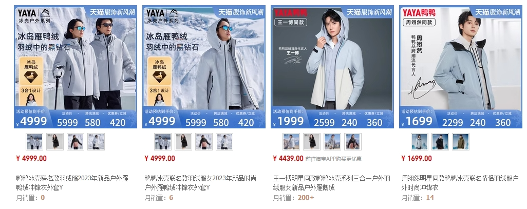 鸭鸭推出的高端线GOOSE系列好一些,因为有王一博代言,且券后价在一千三百元左右,目前在天猫旗舰店的月销量3000多件。但如对比可见,鸭鸭价格亲民的产品,销量几乎可以达到GOOSE系列的十倍,如99元的内胆羽绒服,359的女士长款羽绒服等。