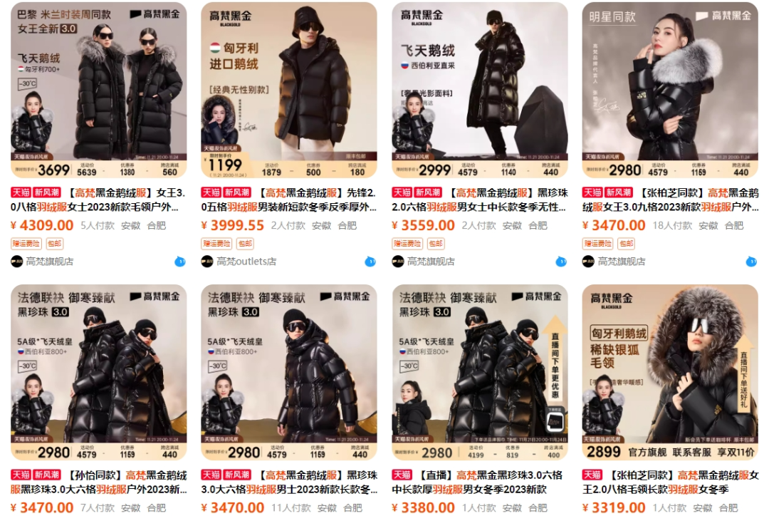 另一边,与一众老牌羽绒服品牌转战高端不同,高梵黑金羽绒服从出道就誓要走高端线,聚焦1500-3000元的中高端市场。除了自称对标“Moncler”,该品牌从其产品到营销包装上,也都一致向国际高端奢侈品牌看齐。
