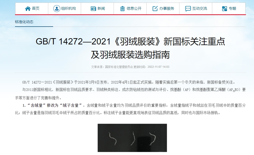同时,自2022年4月开始实施的执行标准为GB/T 14272的最新版《羽绒服装》国家标准,也较上一版做出了诸多调整,包括将羽绒服填充标准从“含绒量”改为“绒子含量”,并要求羽绒服填充物中的‘绒子含量’要在水洗标上标注出来,其含量不低于50%。