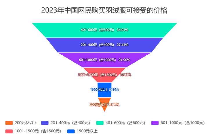 据“艾媒咨询”数据显示,2023年大部分中国消费者更愿意购买价格在1000元以内的羽绒服,最集中的价格段是400-600元,只有3.3%的消费者选择1500元以上价位。