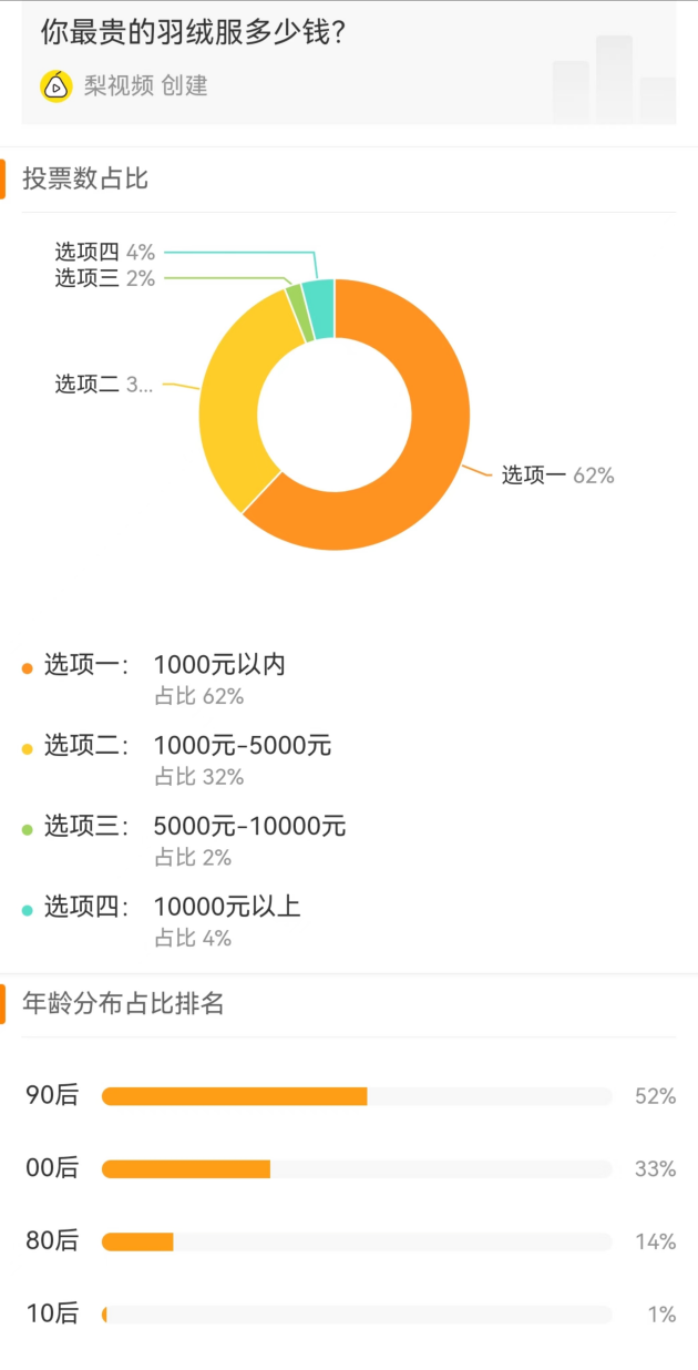 在微博“国产羽绒服卖7000元”的热搜话题里,也有一项超万人参与的#你最贵的羽绒服多少钱#的投票。投票结果显示,“1000元以内”占比高达62%,“1000-5000元”占比有32%,“5000元以上”占比仅有6%。