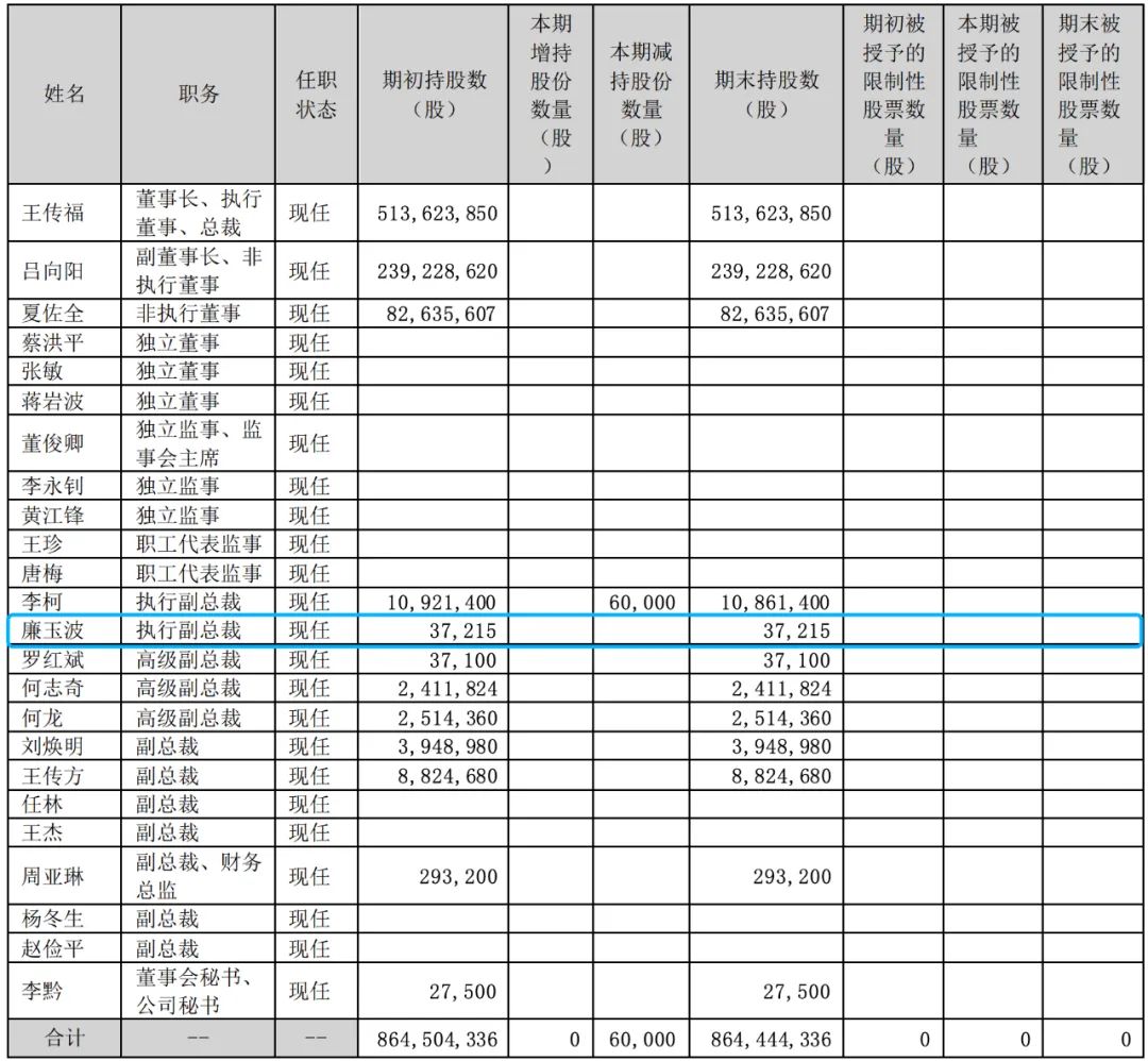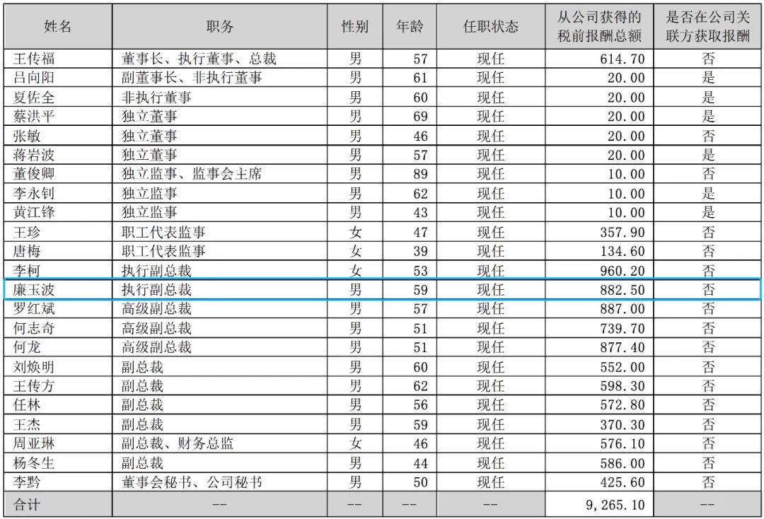 廉玉波在比亚迪的持股并不多,只有37215股,但他的年薪超过一众高管,2022年税前年薪882.5万元,仅次于执行副总裁李柯和高级副总裁罗红斌。