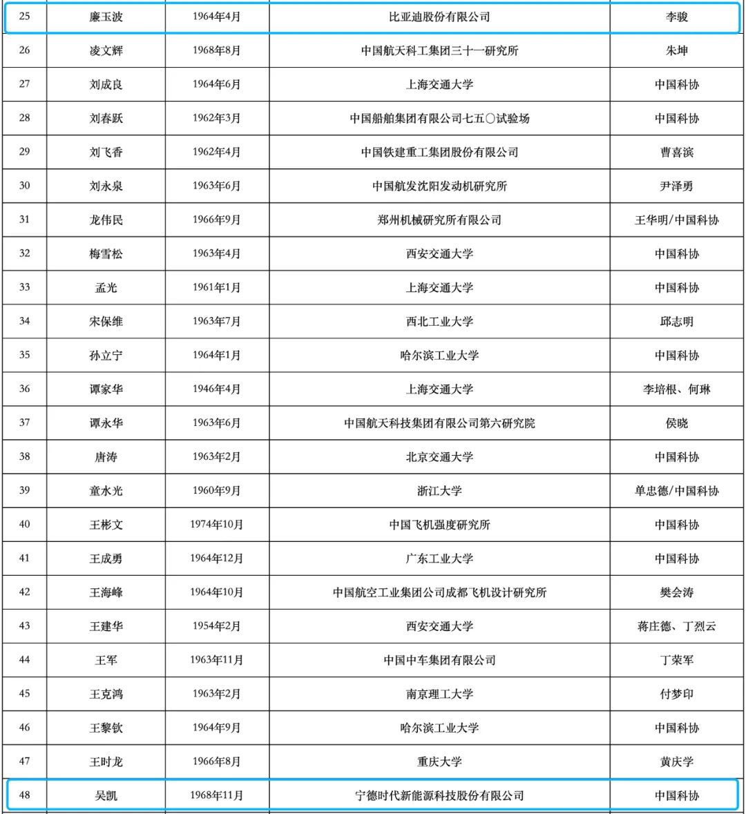 11月22日,中国科学院和中国工程院公布了2023年院士增选结果,此前进入候选名单的比亚迪首席科学家廉玉波、宁德时代首席科学家吴凯均落选。