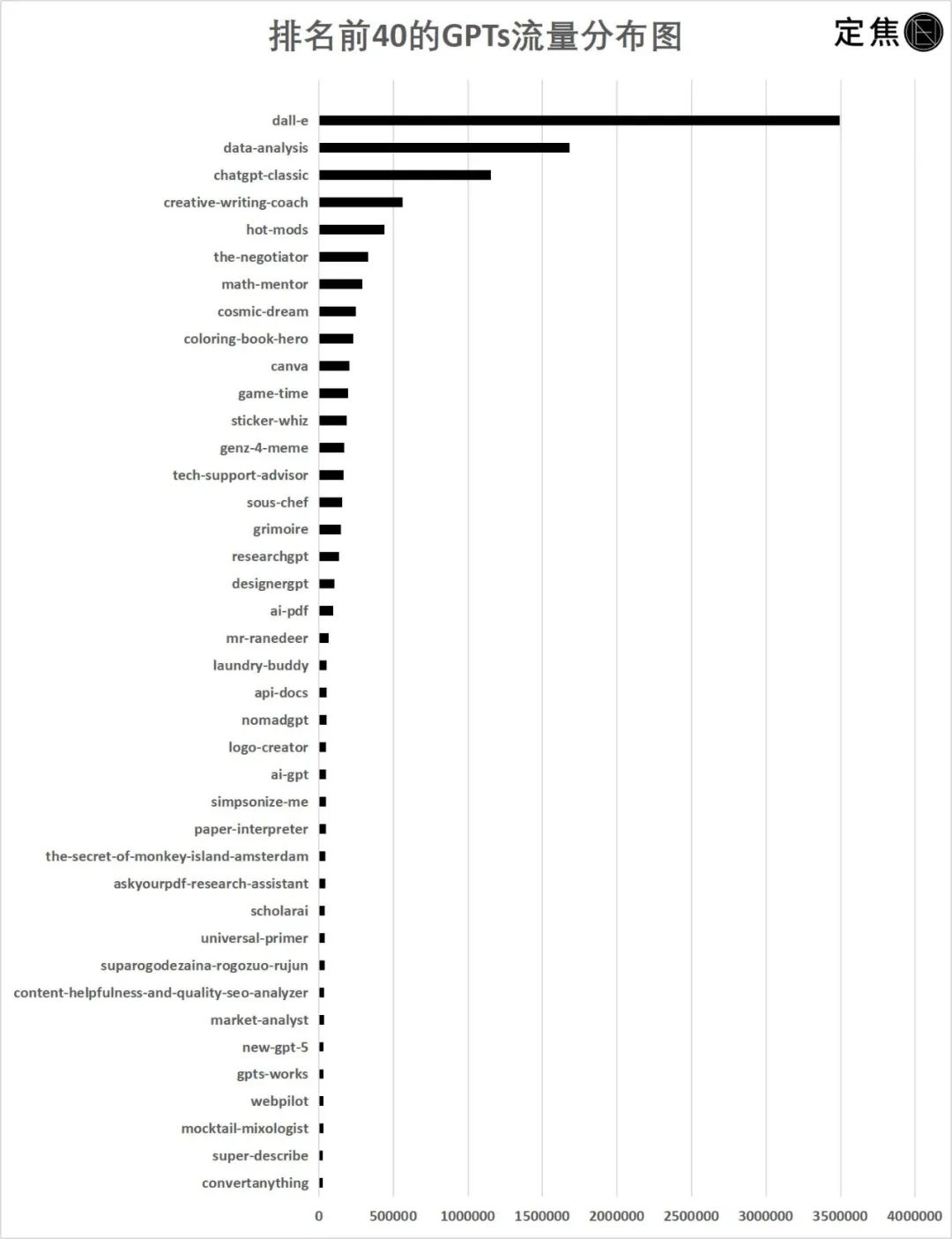 排在第二位的数据分析工具data-analysis,以及第三位的经典版ChatGPT,都是100多万的访问量。前三名吸走了大部分流量。