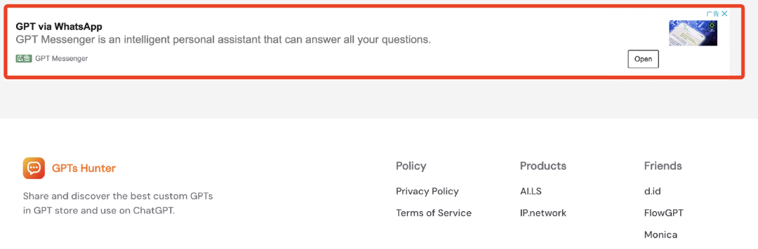 目前,已经有金主在GPTs Hunter网站投放广告,推广自家产品。相当于,这款产品刚上线,就产生了收入。