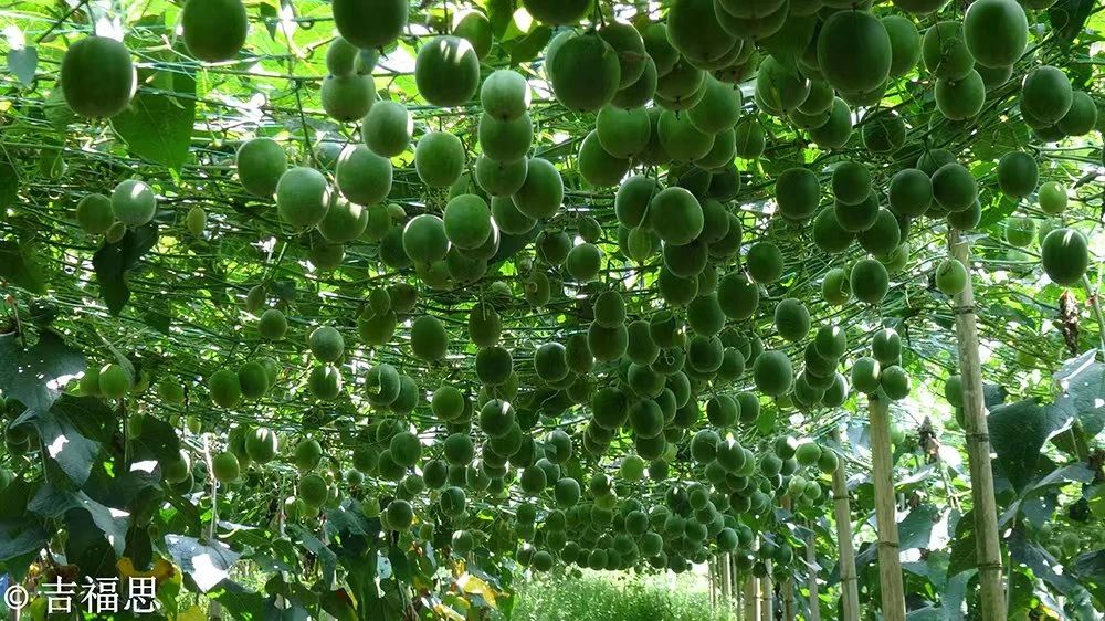 在罗汉果棚架下行走,不是易事。罗汉果属攀援草本植物,目前主要的种植方式便是搭棚,棚高由人高而定,一般在1.7~2米之间。棚架下是排列整齐的竹竿和罗汉果主藤,顶部是攀爬在网上的藤蔓和挂下还未采摘的果实。如想看清长在头顶的罗汉果果实,只能猫着腰,再然后微微抬头。而行走,是最简单的事,罗汉果的施肥、授粉、采摘等主要人工劳作,都要在棚下完成。
