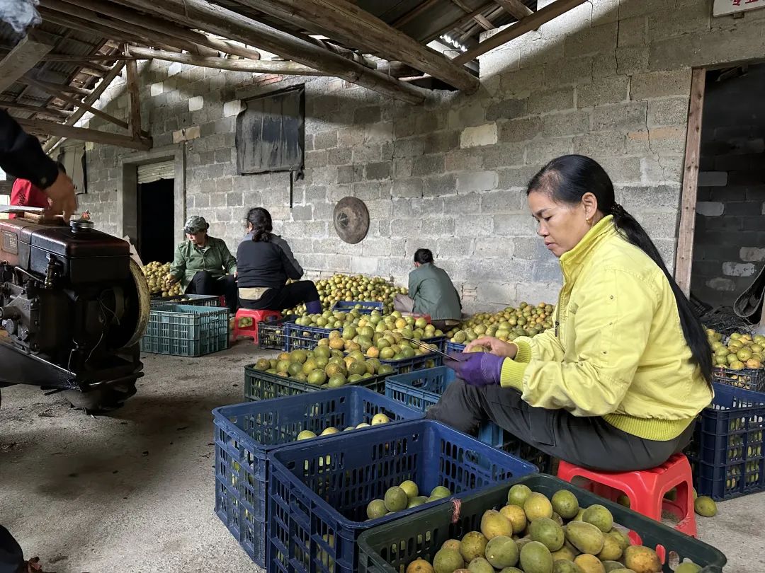 秋意已浓,今年罗汉果下果也到了尾声。村民们简单吃了午饭后,搬了小矮凳,开始准备分拣罗汉果。三四人构成了一条简单的流水线:前端是挑选基础品质,看有没有黑斑和腐烂,如没有问题就放进筐里;后端则是筛选大小,用专门的卡尺逐个测量后,按果的大小分筐。