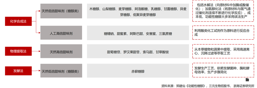 人工合成甜味剂是指通过化学合成方法生产的,甜度数百倍高于蔗糖的甜味剂。天然甜味剂可根据生产方式不同分为两类,一类为通过植物萃取得到的甜味剂,甜度多为蔗糖的200倍或更高;另一类为通过生物发酵法得到的糖醇类或稀有糖类甜味剂,甜度倍数低于蔗糖,其单糖或多糖结构使得在消化分解过程中有少许的热量释放。[2]