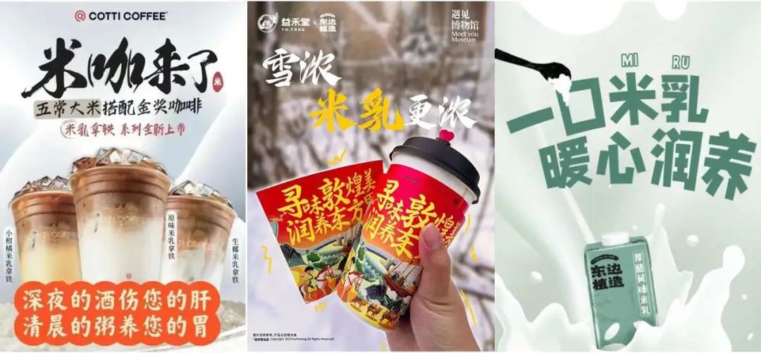 因此,目前不少品牌在米乳产品宣称上也主打温暖养胃、润养身心,库迪一句“深夜的酒伤肝,清晨的粥养胃”,成为人们讨论话题的焦点,益禾堂也打出Slogan“好米出好乳,润养东方胃”,宣称“养胃功效,Oatly宣传语“一口米乳,暖心润养”同样强调用新中式植物基来征服“中国胃”,将功效情绪价值拉满。