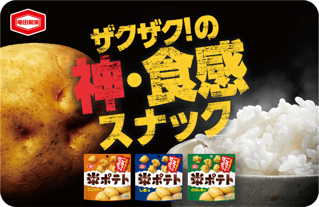 米果有一种特殊的耐嚼口感,这是薯片所不具备的,同时,市面上的土豆零食基本是片状或棒状,而米的加入能让产品呈现米果特有的、表面凹凸不平的块状。因此,龟田制果将“糯米”和“马铃薯”两种原料结合在一起,并运用了米果加工多年积累的蒸、炸技术,创造出嚼劲和酥脆感结合的全新口感米薯块。
