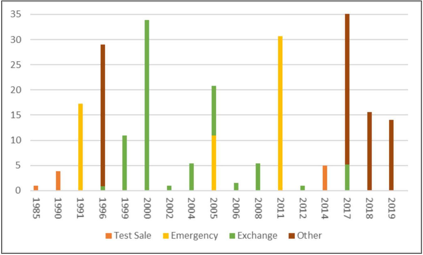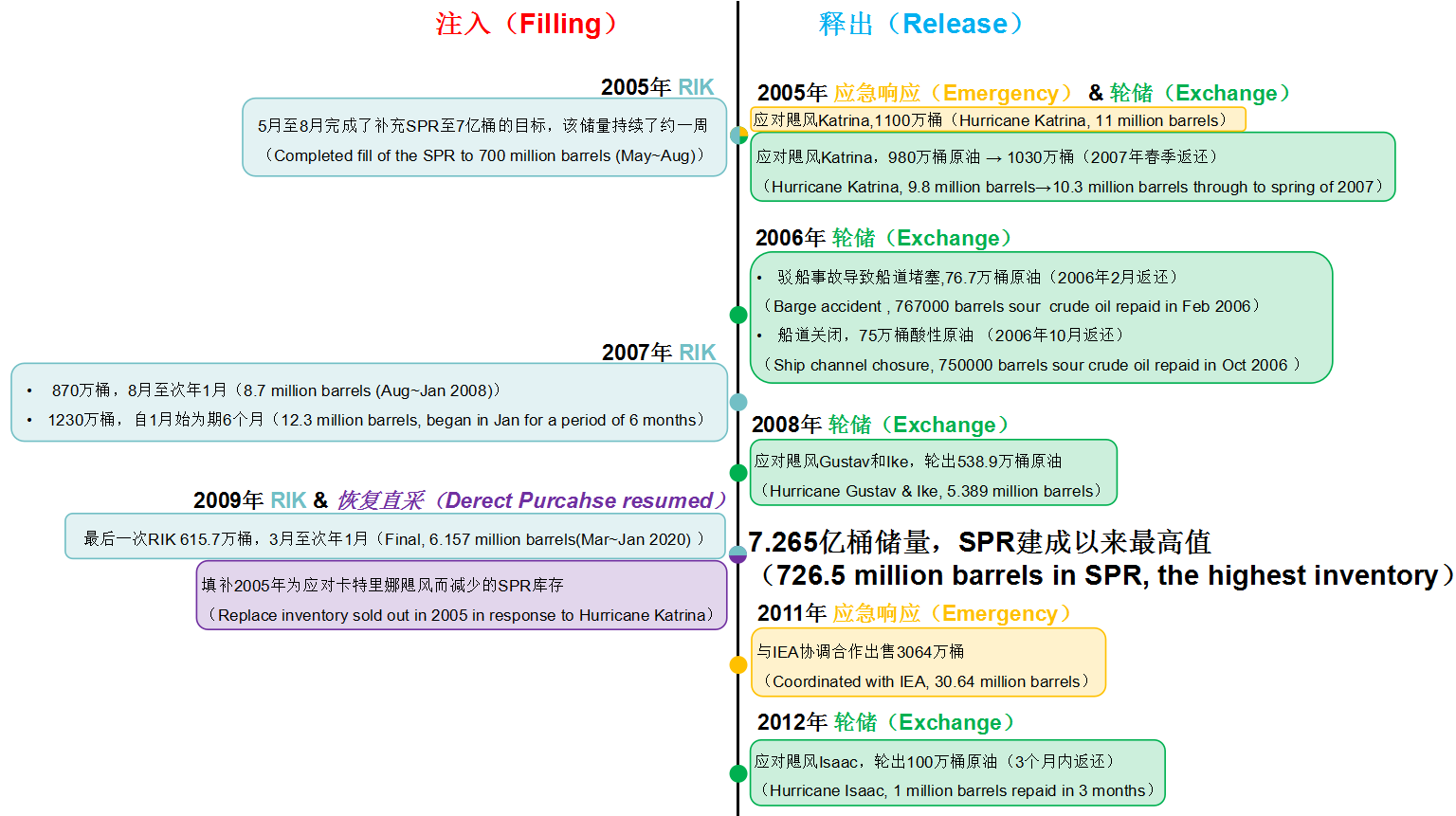 自SPR建立以来,DOE多次运行收释储机制,其模式和目的不尽相同。其中,收储主要通过直采(Direct Purchases), 实物转让特许权使用费(Royalty-in-kind Transfers, RIK), 延期交换(Deferrals and Exchanges)等方式进行;释储主要以试售(Test Sale), 应急响应(Emergency Sale),轮储(Exchange),强制出售(Mandated Sale)和现代化销售(Modernization Sale)为主。 这里,我们主要介绍几种较为常用的收释储机制。