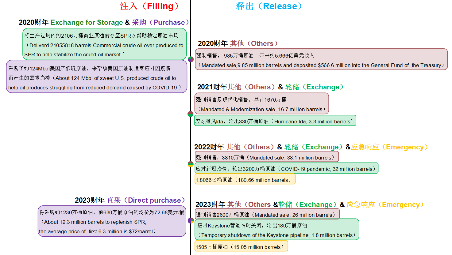 2022年,俄乌冲突爆发引发油价飙升,美国为稳定油价释出1.9亿桶SPR,成效显著;2023年,DOE借油价低迷之势开始补充SPR,一方面推动油价小幅回升,另一方面缓和了因库存新低而产生的市场恐慌。
