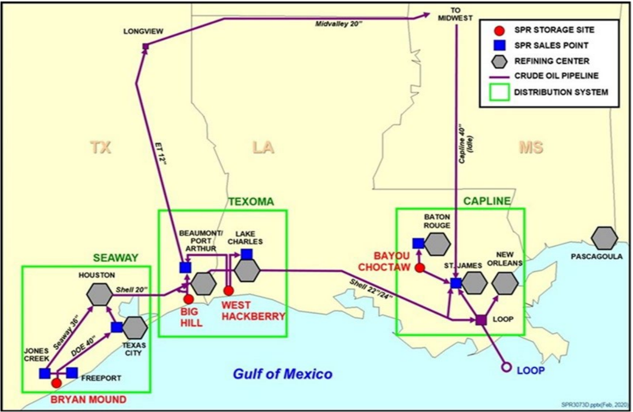 墨西哥湾沿岸的三组管道系统共同构成了SPR的输配系统,它们分别是海路(Seaway)、德克索玛(Texoma)和卡普线(Capline),每个系统都连通一个或多个炼油中心、州际原油管道以及原油集散销售点,这为连接SPR和国家商业石油运输网络提供了最为灵活便利的方案。
