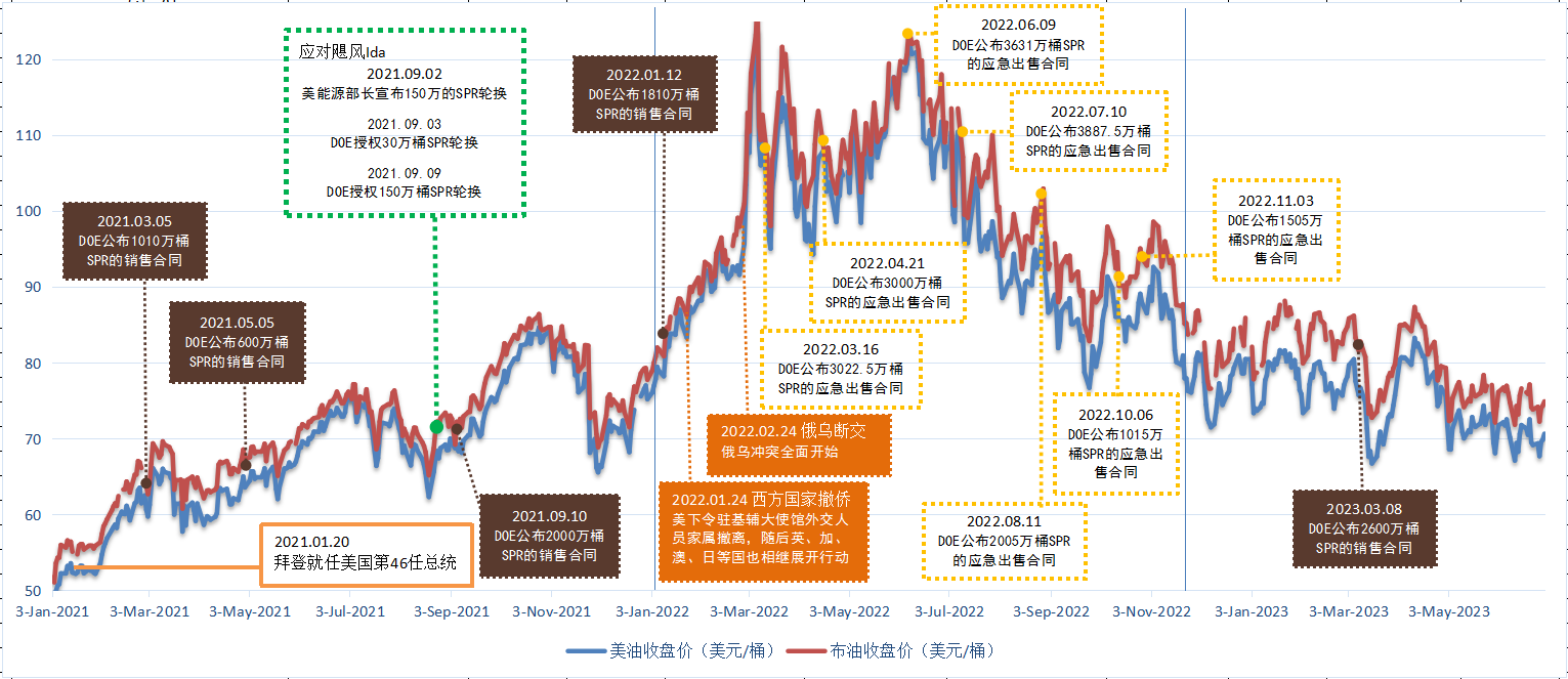 2021年,新冠疫情冲击全球,拜登正式就任总统,全年油价震荡上行,DOE进行三轮售储、三次轮换共计3940万桶SPR。