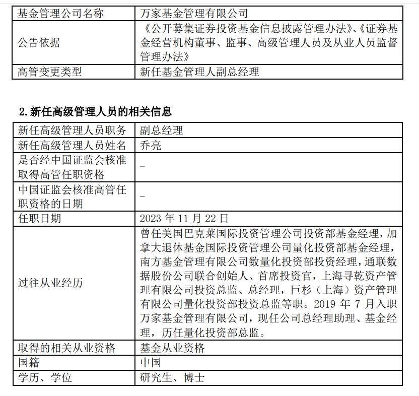 又有知名基金经理“升官”了, 万家基金23日晚间公告,公司总经理助理、基金经理乔亮自11月22日起担任公司副总经理一职。