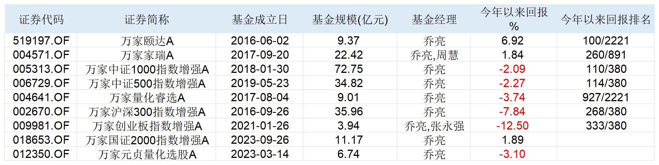乔亮于2019年7月入职万家基金,历任总经理助理、量化投资部总监。目前,乔亮共管理8只基金,管理规模为206.19亿,代表作为万家中证1000指增,截至今年三季度末,规模为72.75亿元。从业绩来看,万家中证1000指增今年以来收益率为-2.09%,在同类产品中排名110/380。
