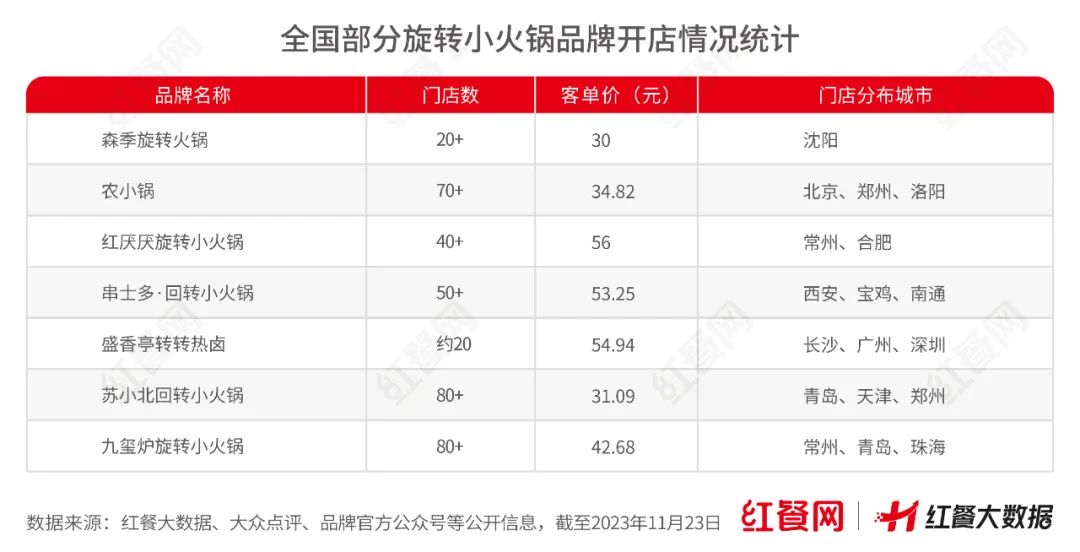 其中,不乏一些打出了一定区域知名度的中小连锁品牌,比如盛香亭转转热卤、农小锅、森季旋转火锅农小锅、红厌厌旋转小火锅、串士多回转小火锅、苏小北回转小火锅、CC旋转小火锅等。
