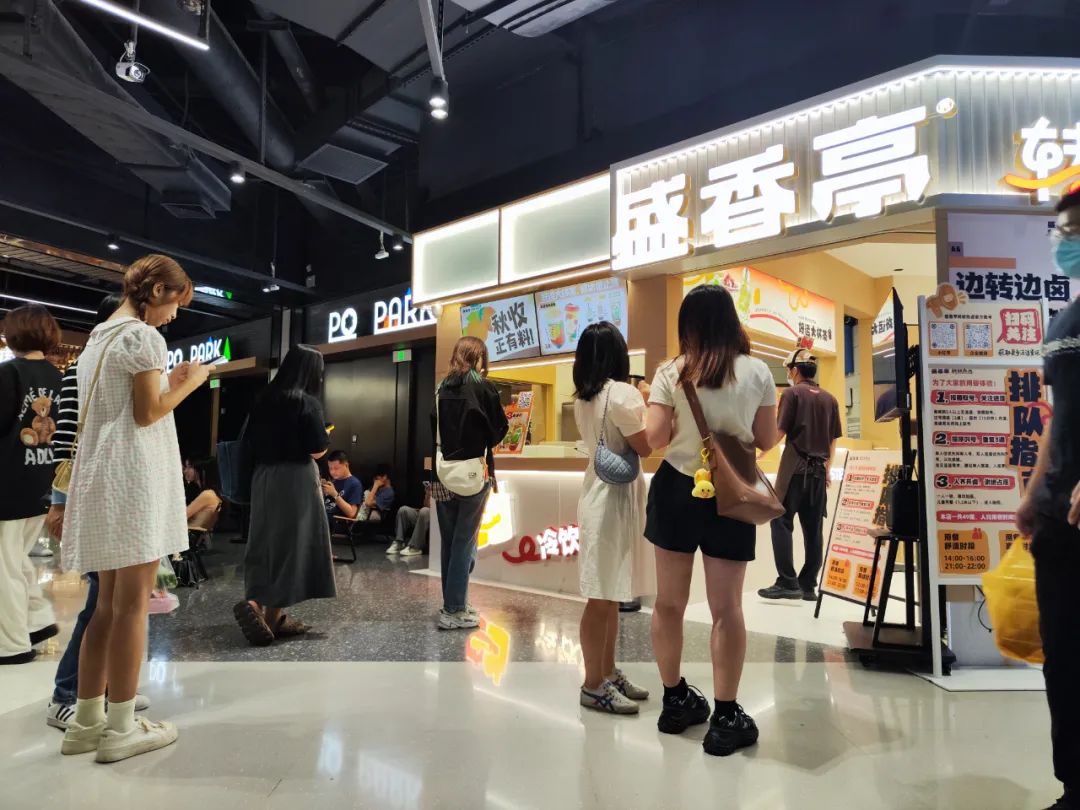 次日午餐时间,红餐网走访了其在广州东方宝泰购物广场的盛香亭转转热卤,生意十分火热,门口坐满了等待叫号的年轻人。而在该时间段,同商场的餐饮店大多不需要排队。