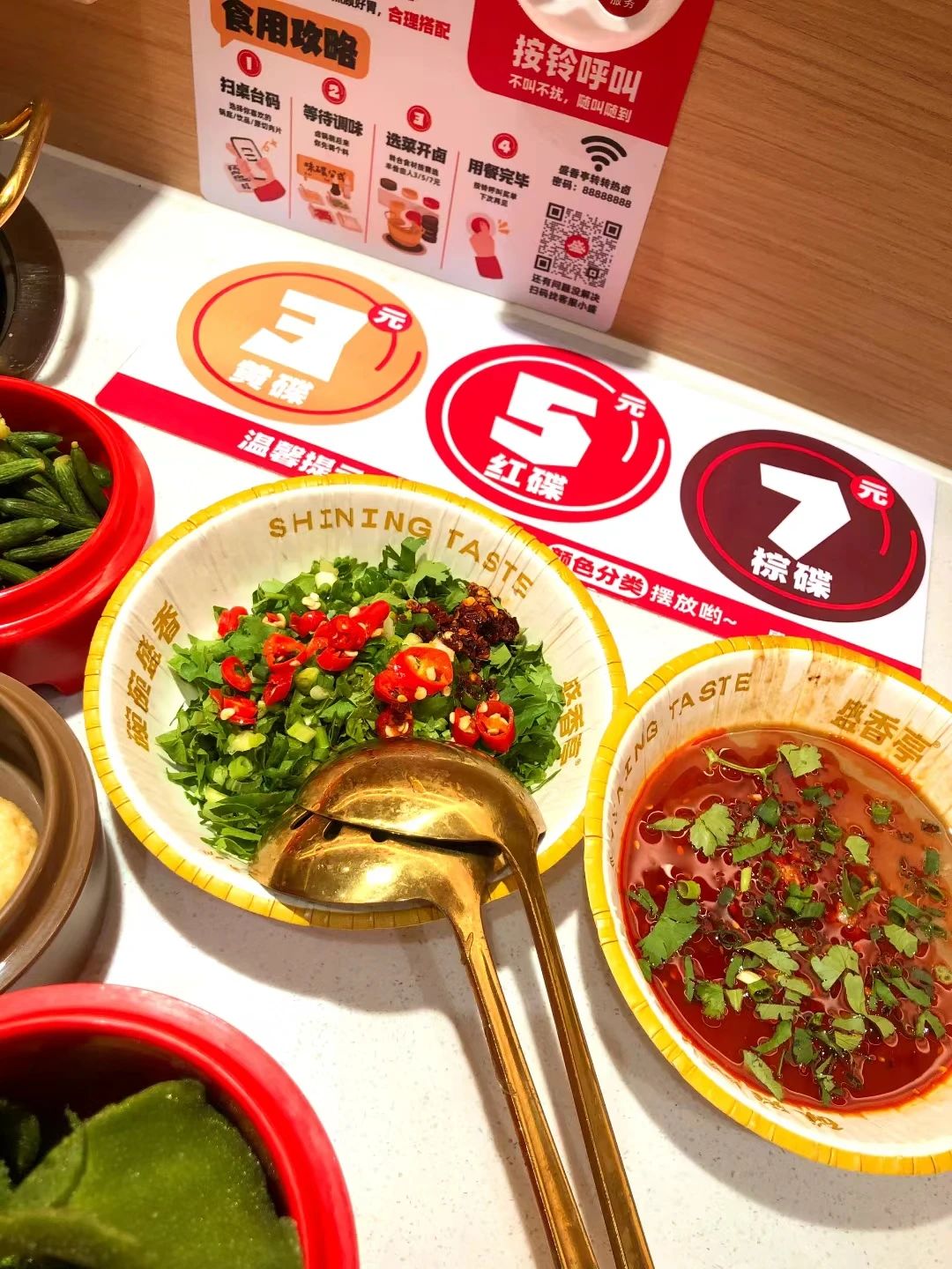 顾客需自行取菜、调制蘸料、烫煮食材;回转架上有3元、5元、7元三种档位的菜品供选择,对应不同颜色的餐碟,3元价位为素菜,5元及7元价位大部分为荤菜。