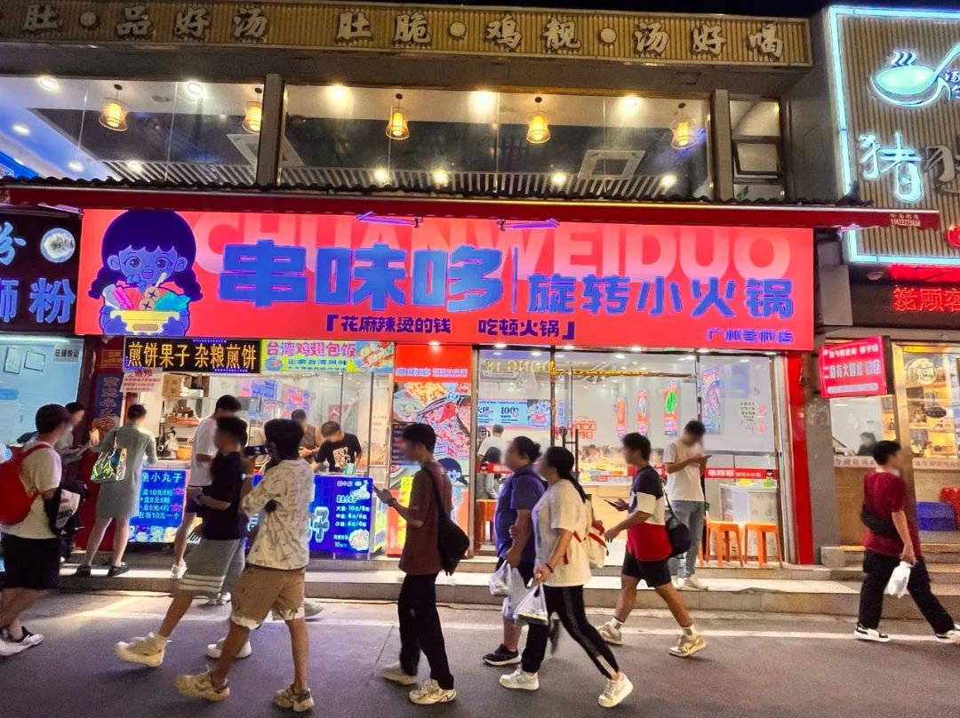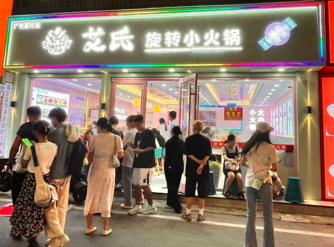 比如位于广州客村地铁站周边的“串味哆旋转小火锅”,傍晚7时许店内已基本坐满,门口也有不少年轻消费者排队,同一条街相隔约50米的“艾氏旋转小火锅”门店也排起了长队。