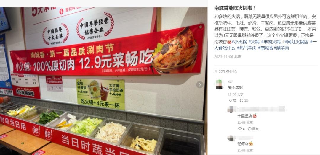 比如,南城香在部分门店推出了37.8元/套的“100%原切肉小火锅”,套餐内容包含鲜蔬、米饭自助无限畅吃、一份100%原切肥牛/鲜羊肉、5元锅底、8种小料。