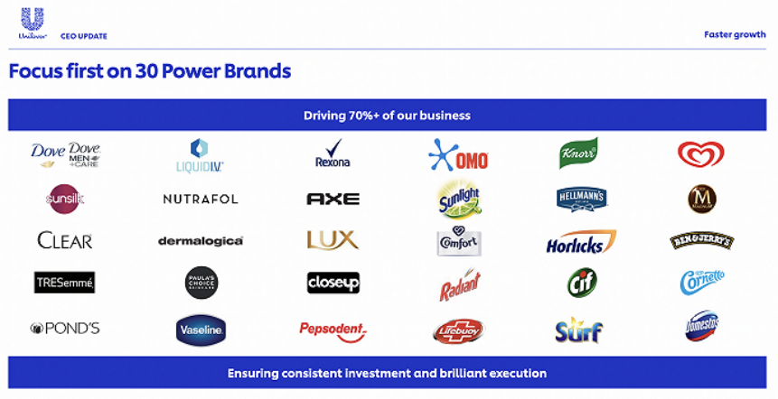 值得关注的是,在“加速增长”上,联合利华的主要举措为简化和精简业务,并将重点放在前30名的“强大品牌”上,这些品牌的增长速度超过了公司的平均水平,创造了70%以上的营业额,其中包括14个“十亿欧元”品牌及16个有潜力跻身“十亿欧元阵营”的品牌。