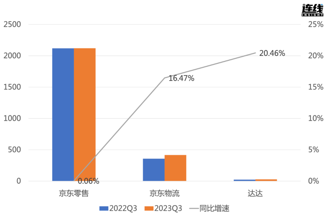 2022Q3-2023Q3京东核心业务的营收规模和同比增速,连线Insight制图