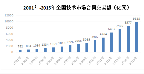 从科技部发布的2016全国技术市场统计年度报告中可以看到,2015年全国技术交易市场共成交307132项技术,实现技术成交额9835.79亿元,较2014年增长14.67%。