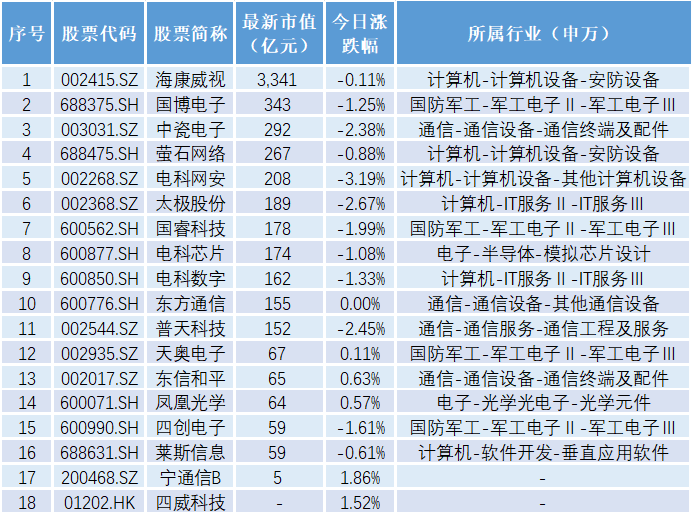 据整理,中国电科旗下共有18家上市公司,包括17家A股上市公司与1家港股上公司。其中市值最大的为海康威视(002415.SZ),最新市值为3341亿元;其次为国博电子(688375.SH)343亿元、中瓷电子(003031.SZ)292亿元。
