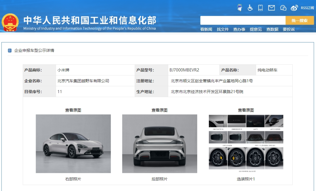 工信部《道路机动车辆生产企业及产品公告》(第377批)披露,提交两款小米牌纯电动轿车的企业名称是北京汽车集团越野车有限公司,即北汽集团100%持股的子公司。两辆车的尾标都是“北京小米”,但生产地址则是北京市北京经济技术开发区环景路21号院,这是小米自建工厂的所在地。