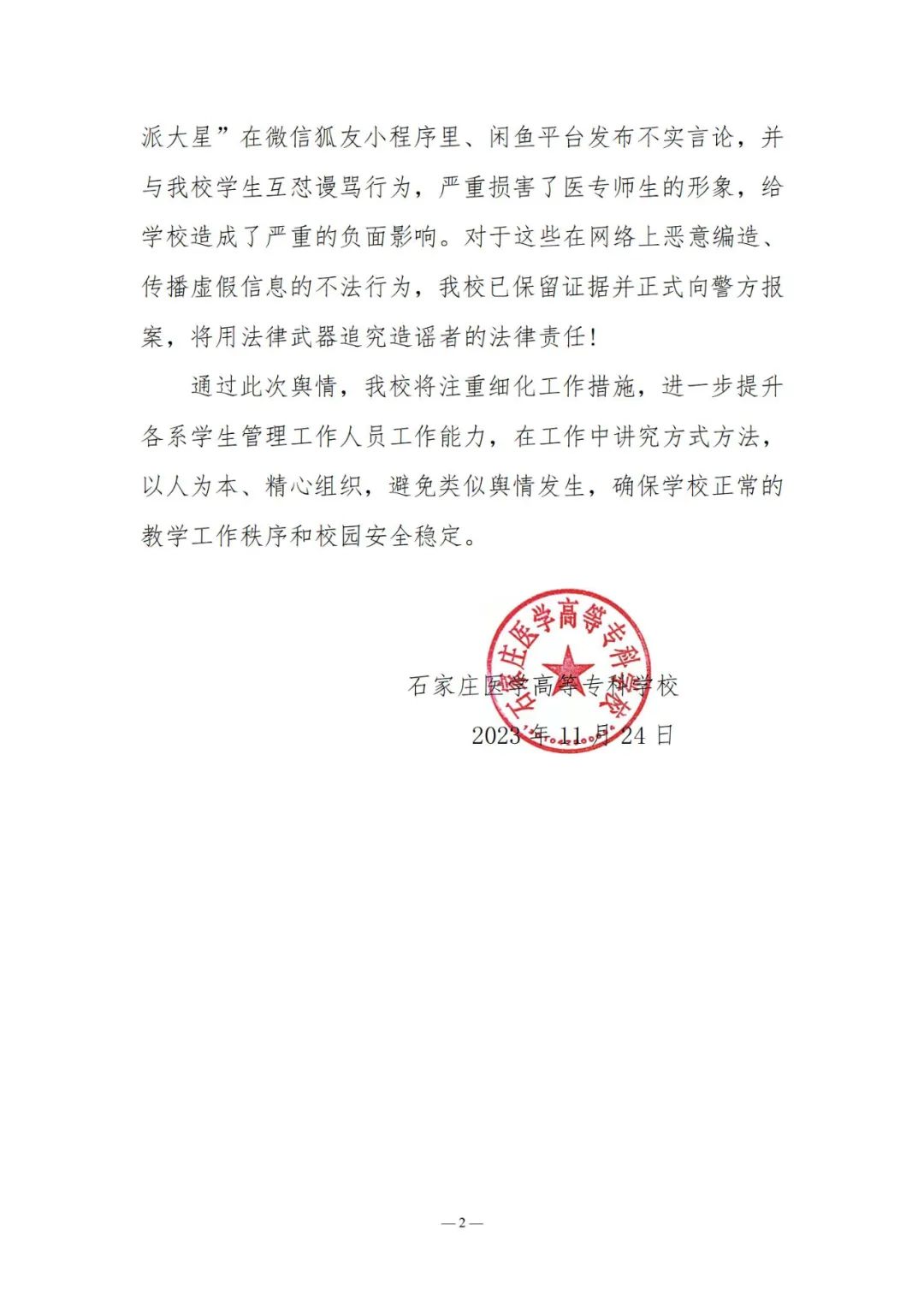 近日,网传石家庄医学高等专科学校检查学生宿舍,并将没收来的物品挂在二手平台咸鱼上出售,事件引发关注。11月24日,石家庄医学高等专科学校发布声明称,22日学校利用学生在宿舍时间,排查大功率违规电器。查获违规电器分别由各系登记造表、统一保管,定于放寒假时返还学生带回家。经核实,网传短视频实为学生准备去实习一起收拾房间物品时的视频,被别有用心人员移花接木、恶意引用。此外,网名为“林北我叫派大星”在微信狐友小程序里、闲鱼平台发布不实言论,并与学校学生互怼谩骂行为,严重损害了医专师生的形象,给学校造成了严重的负面影响。学校已保留证据并正式向警方报案。