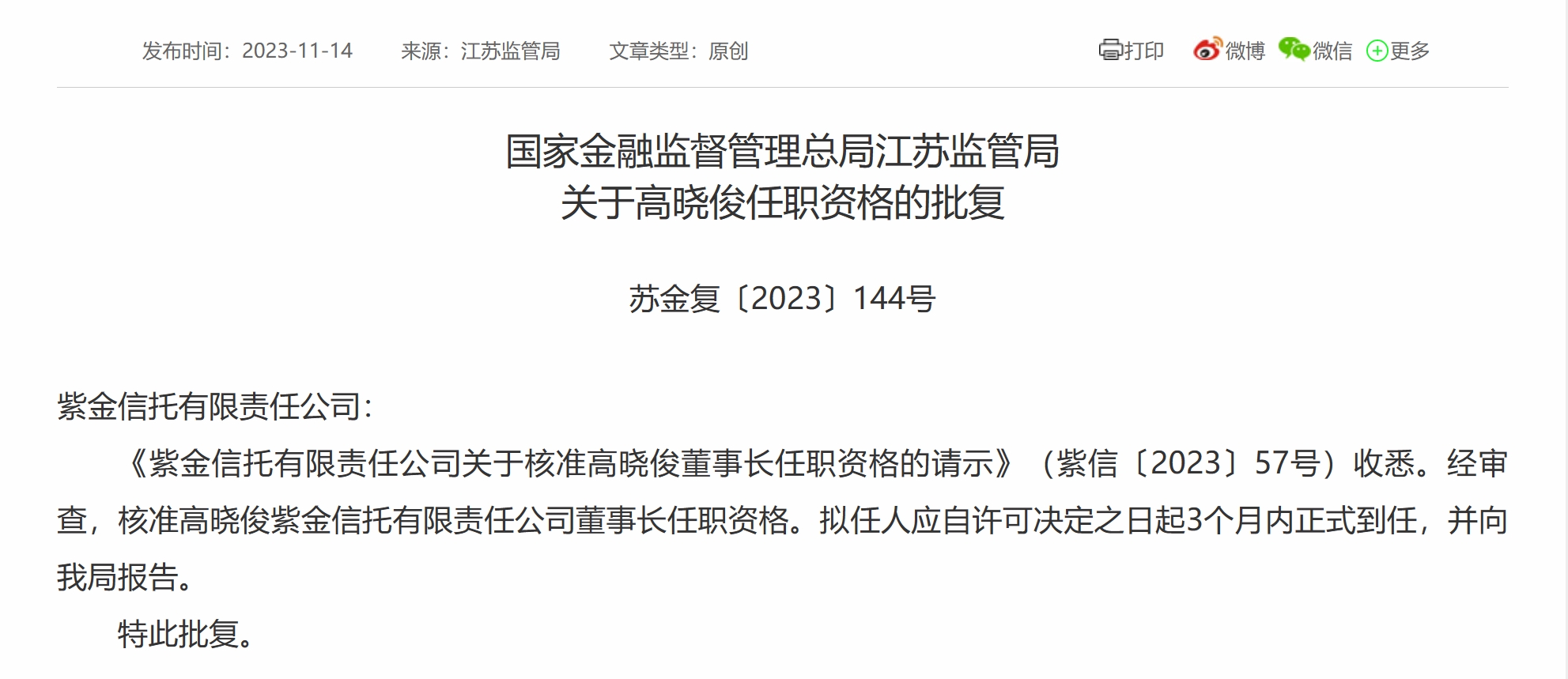 11月24日,国家金融监督管理总局消息,紫金信托有限责任公司(下称:紫金信托)高晓俊董事长任职资格获江苏监管局核准批复,批复时间为11月14日。