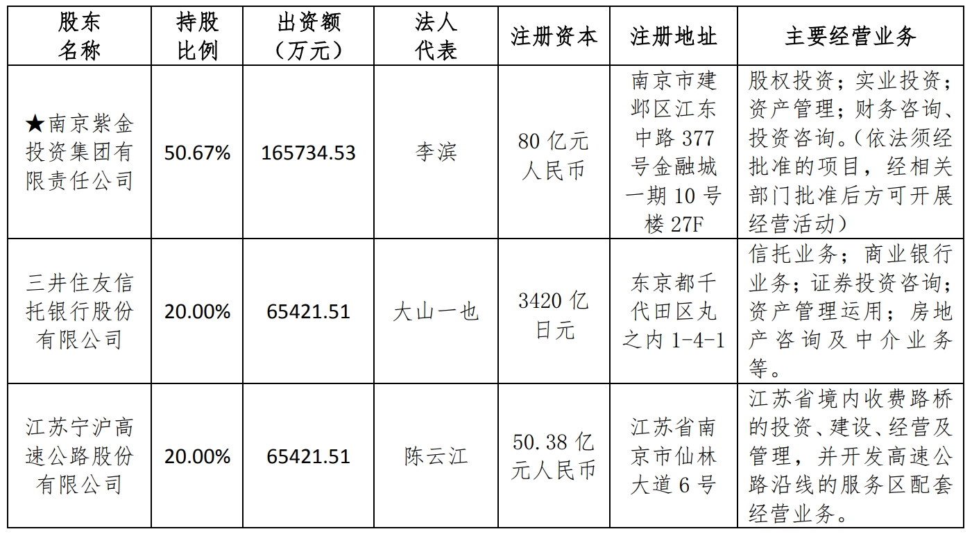 年报披露,紫金信托前身为南京市信托投资公司,成立于1992年,最新注册资本32.71亿元人民币。2010年,公司实施增资重组,并重新登记,更至现名。公司控股股东为国资全资设立的南京紫金投资集团有限责任公司。