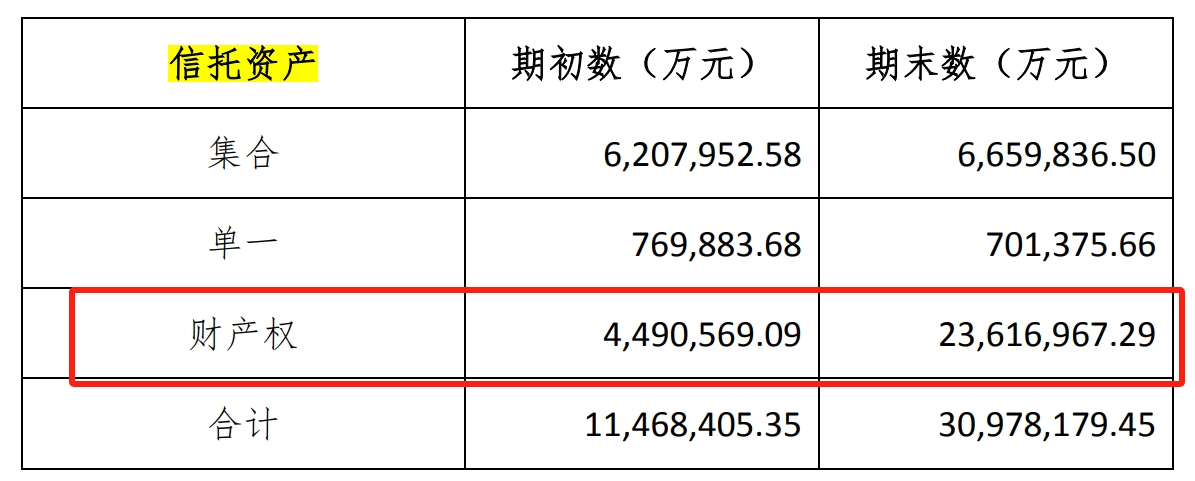 截至2022年末,公司信托资产余额3098亿元,较期初增长1.70倍。报告期内,公司财产权信托实现较期初4.27倍增长,截至2022年末,财产权信托合计2362亿元,为紫金信托第一大信托资产类型。但对于这一部分信托资产暴涨原因,年报并未进行解释。