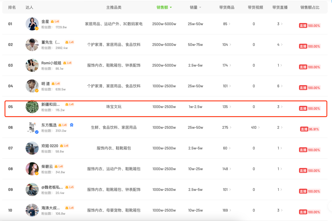 但娱乐独角兽发现,事实上这些低客单价的产品。并非这些珠宝直播间主要的收入来源。毕竟在老郑直播间销量前五名的商品,销售额加起来也不过几百万,跟过亿的GMV仍有很大差距。