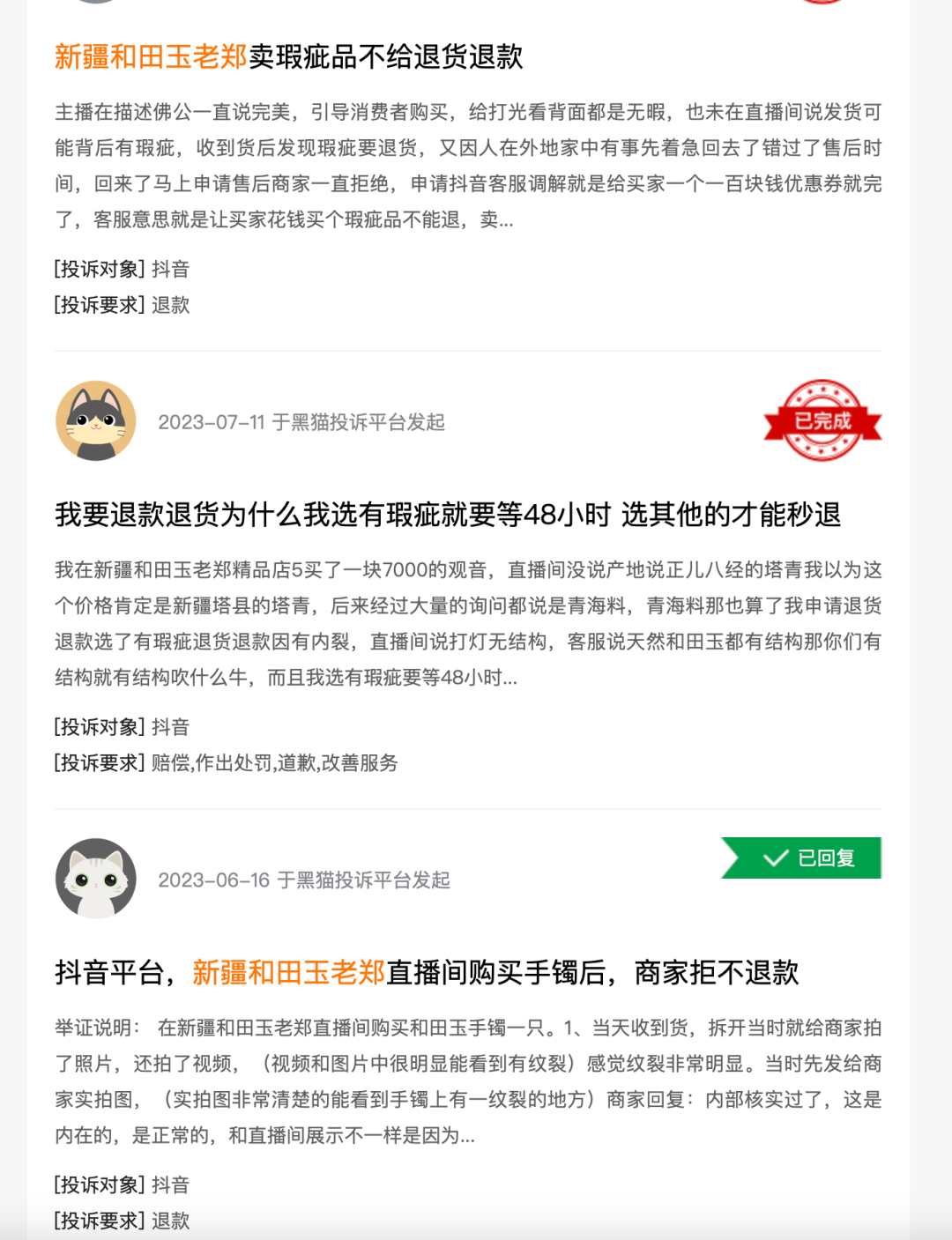 有用户称,自己在新疆和田玉老郑直播间购买价值1万元手镯,收到货后发现肉眼难以看到的多处暗裂,并且多名用户都表示自己退货后,商家以各种理由拒绝退款。