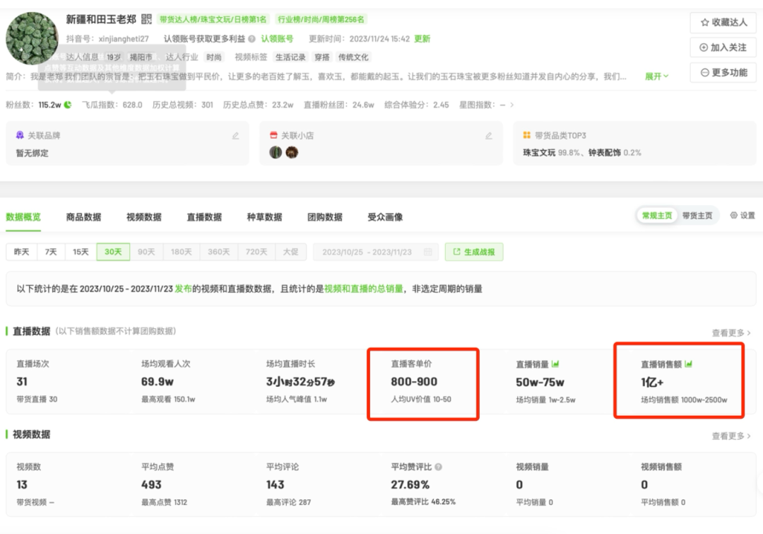 而上述垂类直播间的转化,甚至更优于这些大主播,新疆和田玉老郑就以115万粉丝却撬动了146万的销量,他是如何做到的?