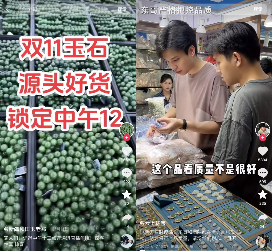 娱乐独角兽注意到,此前黄圣依夫妇直播就选在了中国珠宝圣地广州的华林玉器街进行直播,并将直播地点设在街头,主打源头售卖珠宝,并且在直播间通过“砍价”把一两万的珠宝翡翠砍刀一两千。新疆和田玉老郑和云上珠宝,也曾多次发布自己在源头工厂选品的视频。