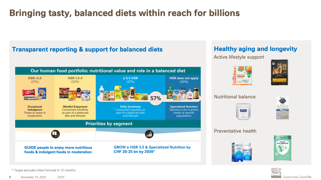 小食代留意到,施奈德在论坛上给出的演示材料显示,雀巢把这块领域的产品统称为“健康老龄化和长寿”,并分成了三大类,包括“支持健康的生活方式”、“营养平衡”,以及“预防性健康”。在中国市场早前推出的雀巢“怡养”系列的一款产品图片,也在当中被呈现。