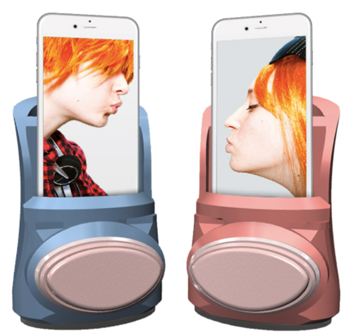 随着(黑)科技的不断发展,一些我们无法想象的场景也将成为现实。有公司发明了一款iPhone硬件:手机接吻器(The Kissenger),只要轻轻吻一下这个装置,电话那头的他就可以在自己的装置上感受到你饱含爱意的亲吻了。