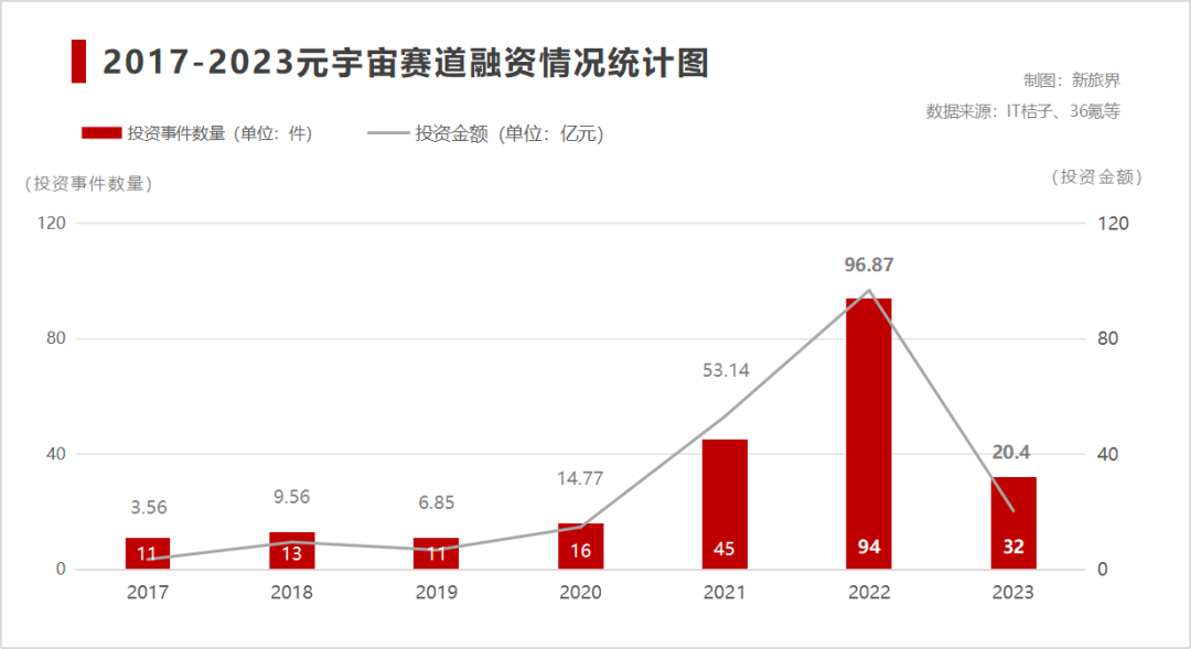 根据IT桔子的投资数据统计,以XR为核心技术的元宇宙赛道内,投资事件从2022年的94件锐减至今年的32件,投资金额从96.87亿元缩减至20.4亿元。