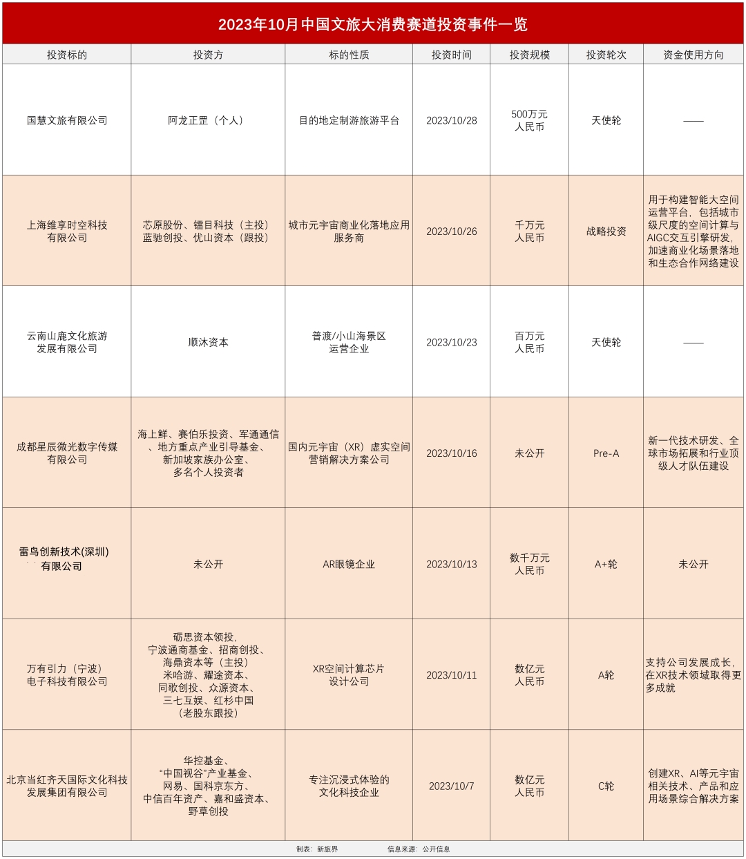 2023年10月份,文旅大消费赛道一级市场总计有7起投融资事件,其中5起与XR相关:当红齐天完成C轮融资、宁波万有引力完成A轮融资、成都星辰微光完成Pre-A轮融资、上海维享时空获得战略投资、雷鸟科技数完成千万元A+轮融资。